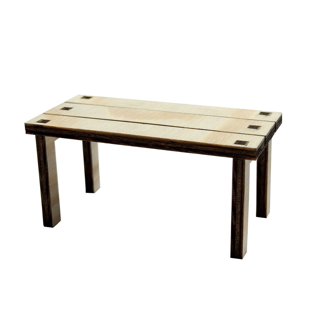 Litet miniatyrbord i 4 mm furu, 8 cm långt. Passar ihop med våra miniatyrstolar och är perfekt för nissedörrar, dockskåp och små världar.
