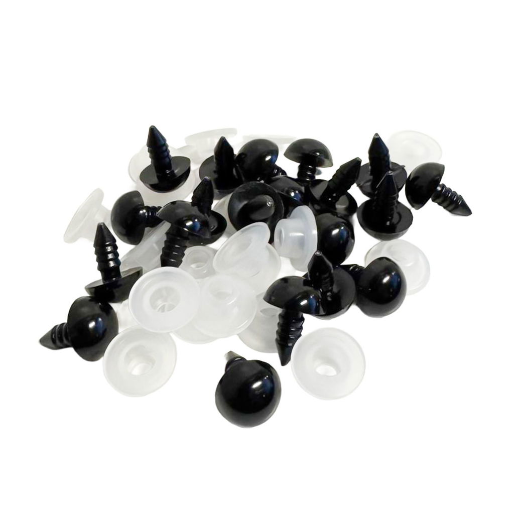 Svarta säkerhetsögon för amigurumis och andra figurer. 10 mm med tillhörande låsbrickor. Paket med 20 st (10 par) i tålig plast.