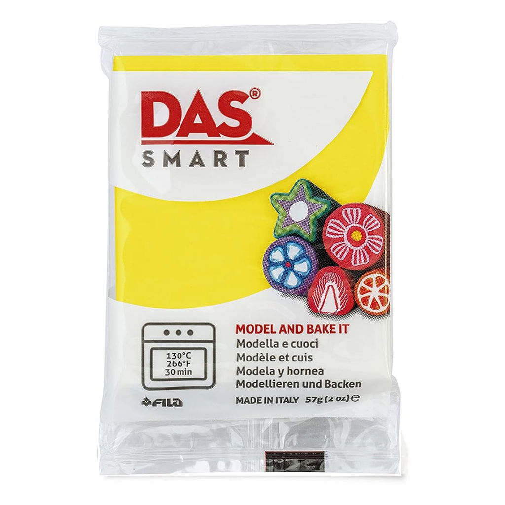 DAS Smart Lemon Yellow 57 g är en ugnshärdande polymerlera med en jämn och följsam konsistens. Den är enkel att forma, håller detaljer väl och lämnar ingen färg på händerna vid arbete.