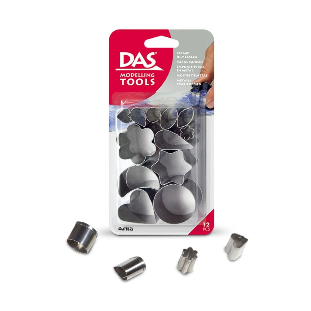 Set med 12 metallformar som gör det enkelt att skapa tydliga, fina avtryck i lera. Formarna kommer i olika storlekar och former, perfekt för dekorationer, hängen eller små figurer i lufttorkande lera eller DAS Smart.
