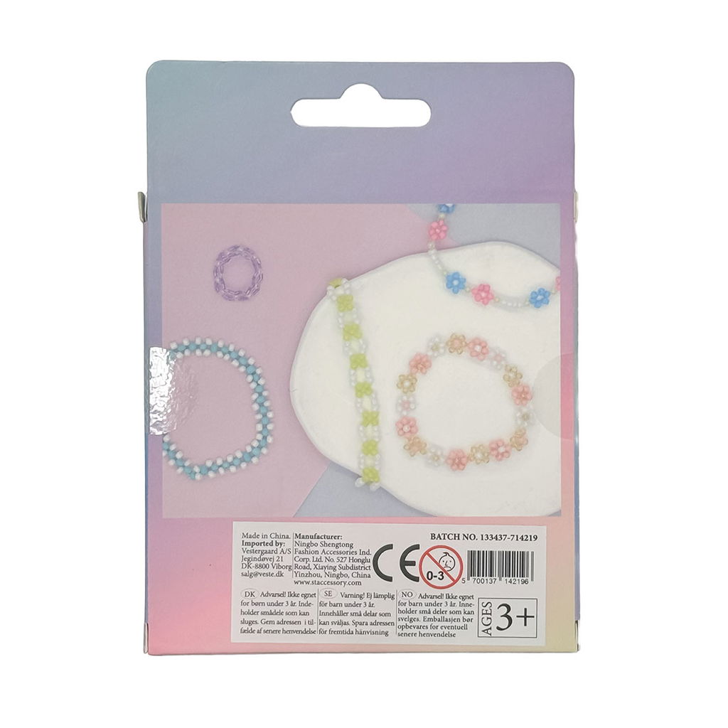 Asken innehåller pärlor i följande färger: vit, röd, orange, grön, lila, turkos och rosa. Med den medföljande elastiska tråden kan du direkt börja skapa armband, halsband och andra smycken. Ett roligt set för både barn och vuxna.