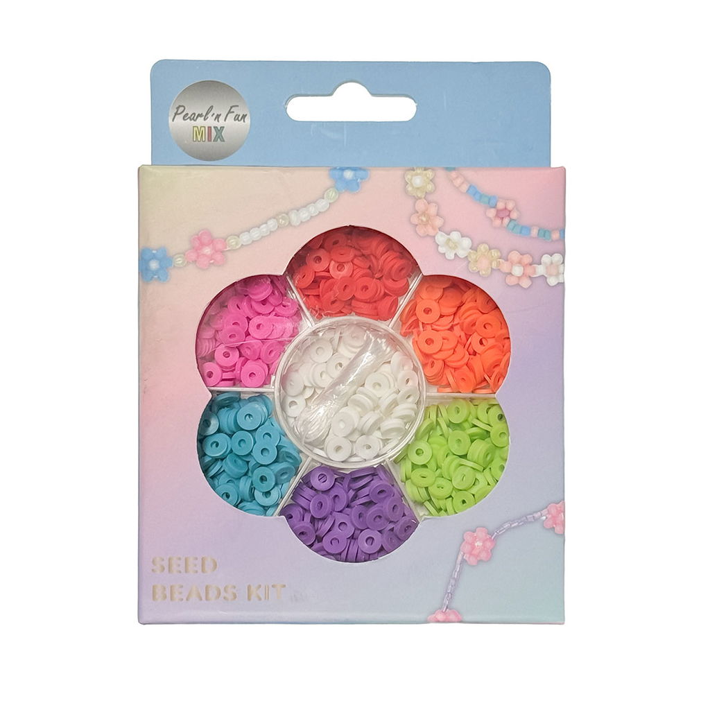 Denna färgglada pärlmix består av platta heishi-pärlor i mjuk plast, vilket gör dem sköna att bära och enkla att trä upp. Pärlorna har en diameter på ca 5,7 mm och ett hål på ca 2 mm, perfekt för elastiskt snöre som medföljer. Levereras i en praktisk ask med fack i blomform, så du enkelt kan hålla ordning på färgerna.