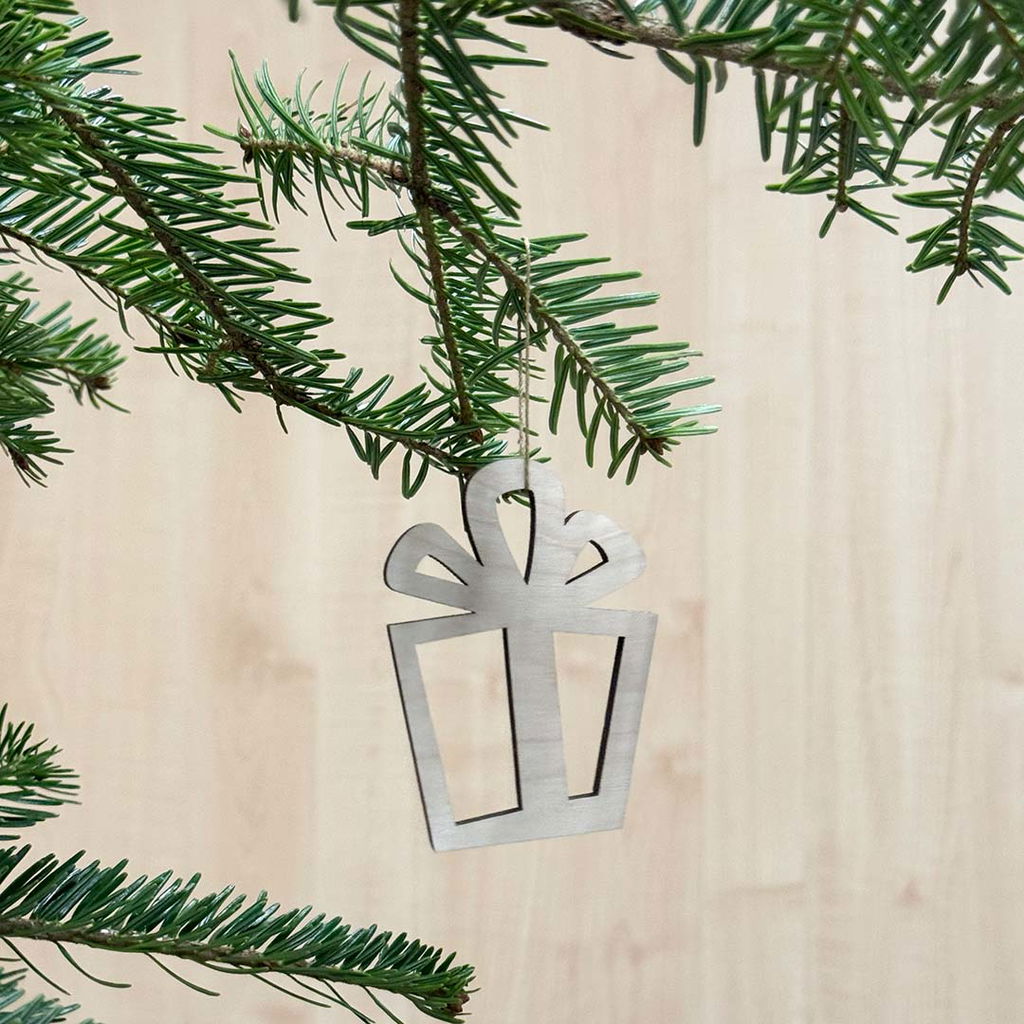 Stilrent julgranshänge i form av ett paket av fin björkplywood 6 mm. Häng upp direkt i granen eller använd som en del av ditt övriga julpynt.