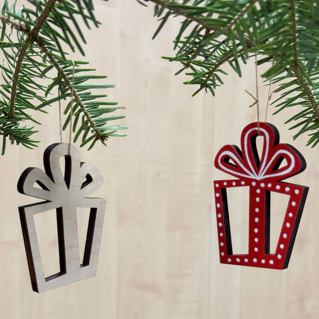 Ge din julgran en festlig och stilren look med detta julgranshänge i form av ett paket på ca 7,6 cm. Den utskurna designen med rosett upptill gör hänget både elegant och lekfullt – perfekt för att skapa en varm julstämning. Tillverkad av fin björkplywood 6 mm som ger kvalitetskänsla som passar både traditionella och moderna julgransdekorationer.