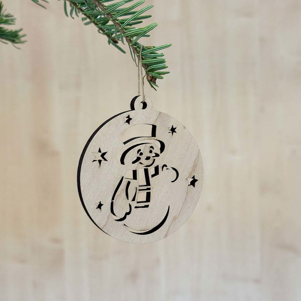 Charmigt julgranshänge i form av en snögubbe i kula av fin björkplywood 6 mm. Häng upp direkt i granen eller använd som en del av ditt övriga julpynt.