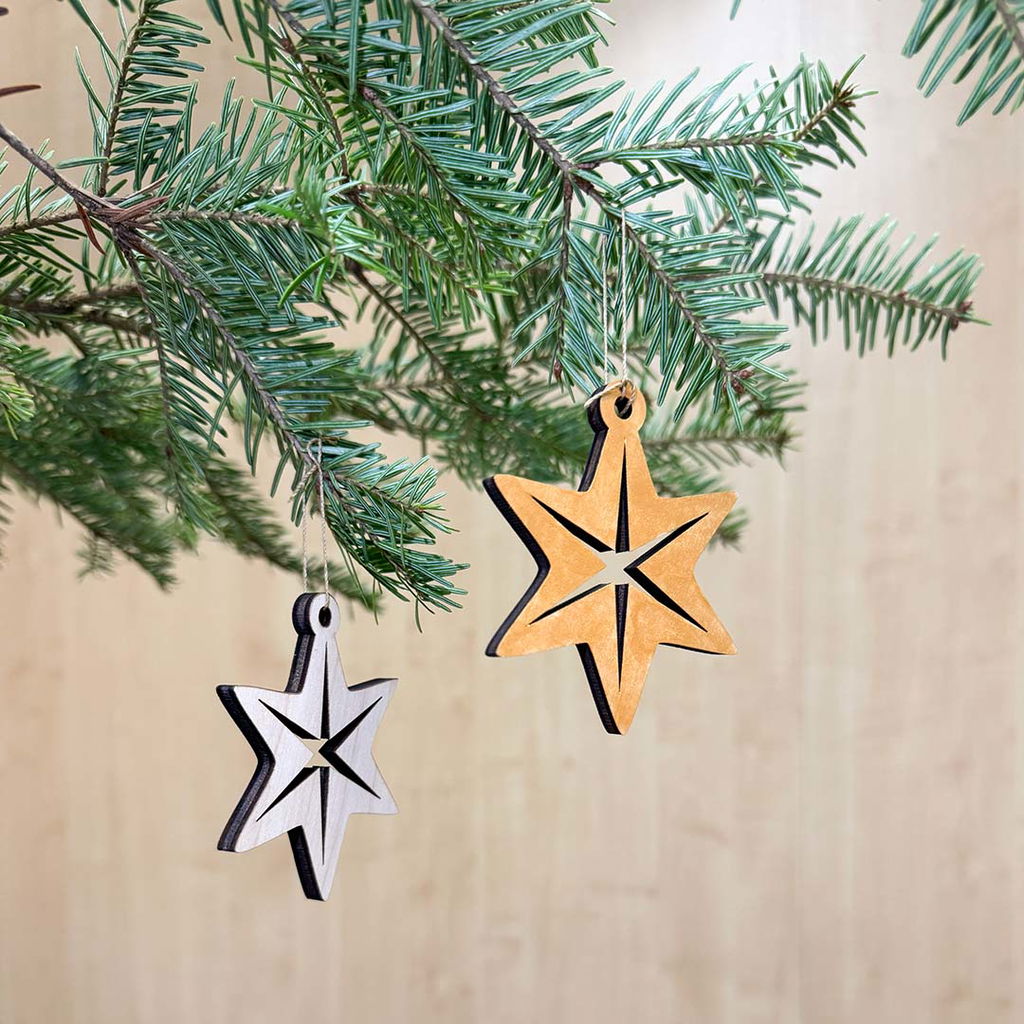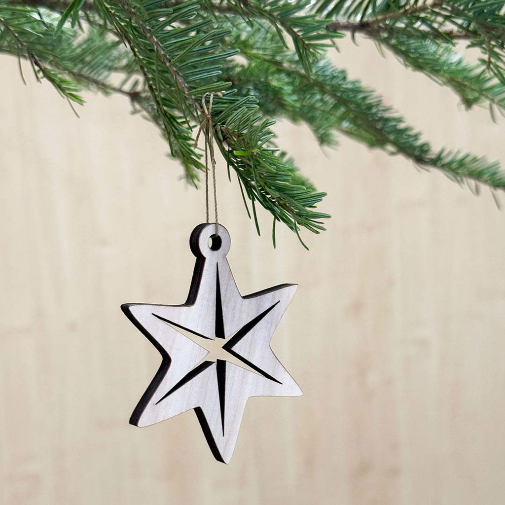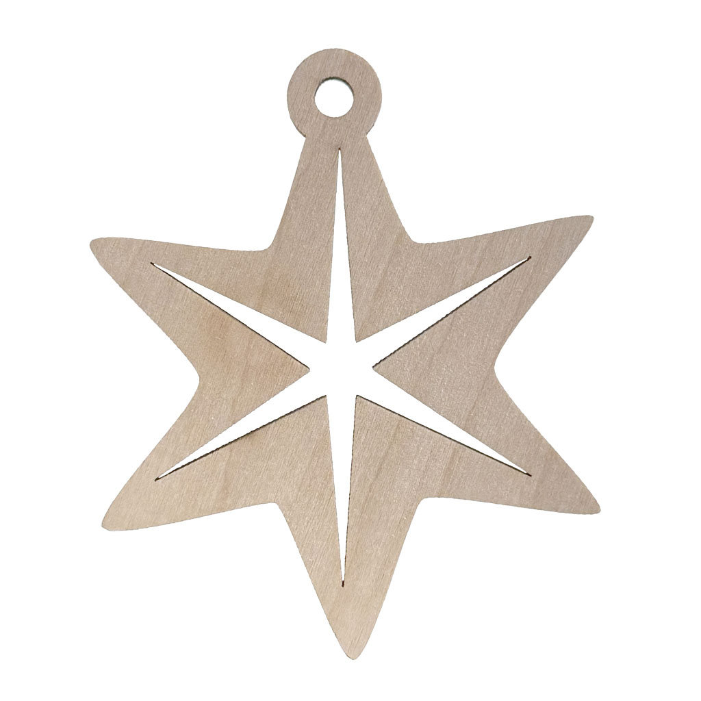 Stilrent julgranshänge i form av en nordisk stjärna av björkplywood 6 mm. Passar både traditionella och moderna juldekorationer.