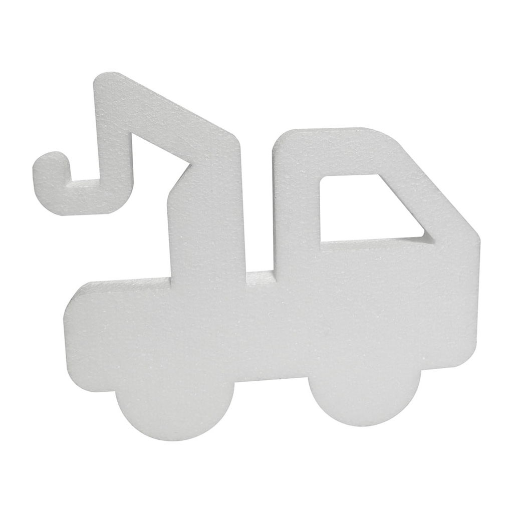 Frigolitfigur i form av lastbil med kran, 30 cm lång och 25,5 cm hög. 3 cm tjock med slät yta. Kul bas för pyssel, dekoration och temaprojekt.