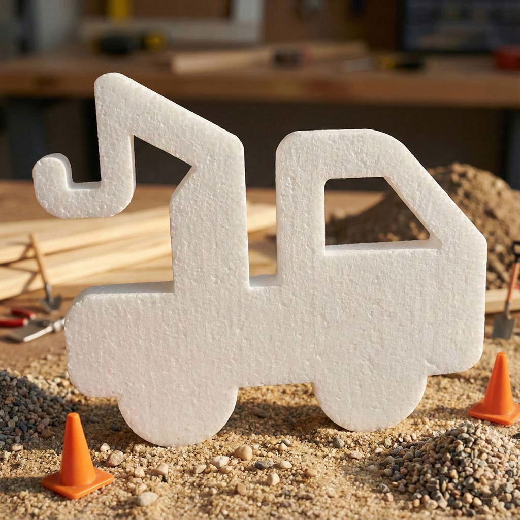 Denna frigolitfigur är formad som en lastbil med kran och har en lekfull, tydlig siluett som passar många kreativa sammanhang. Figuren mäter cirka 30 cm i längd, 25,5 cm i höjd och är 3 cm tjock. Ytan är slät med platt fram- och baksida, vilket gör den enkel att måla, klä eller dekorera efter eget tema.
