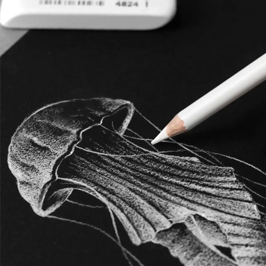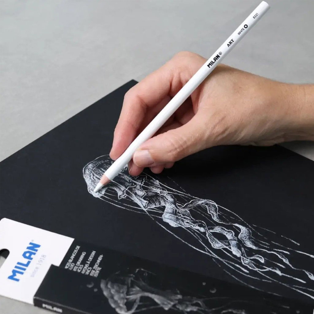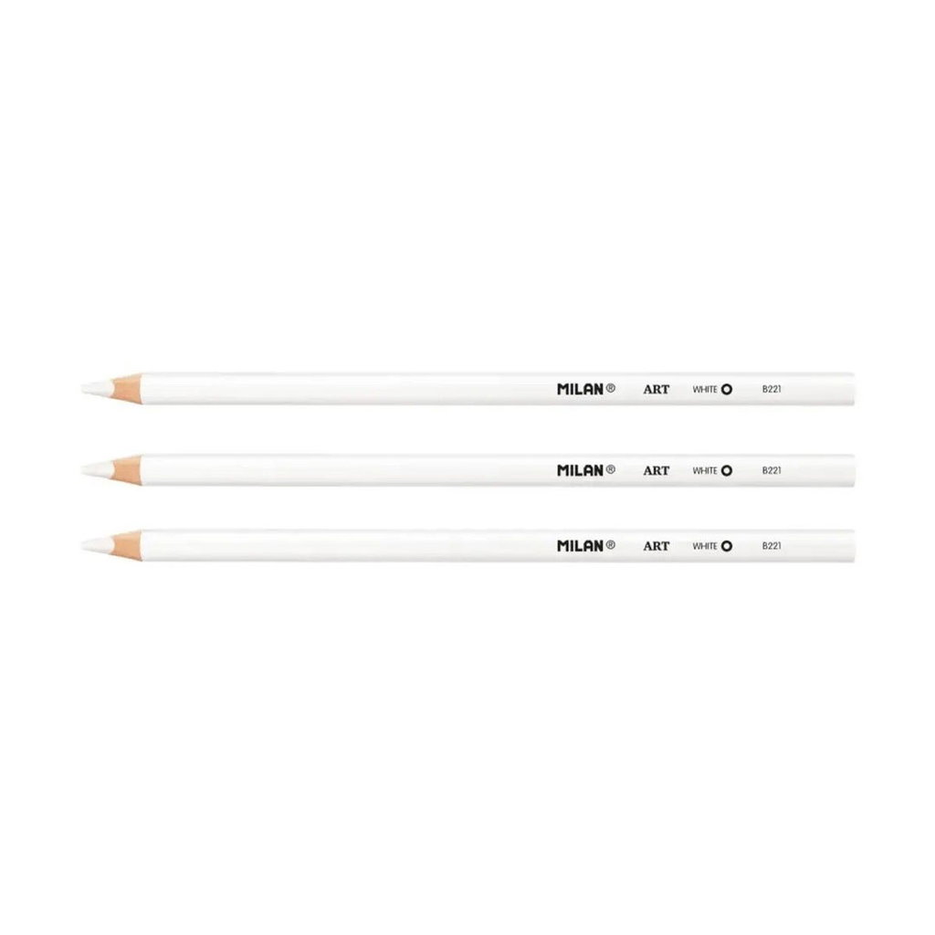 Ett set med tre vita ritpennor och ett radergummi från Milan. Pennorna används för att rita, markera och skissa på mörkt eller svart papper. Stiftet är 4 mm tjockt och ger ett mjukt, jämnt drag med bra täckning.
