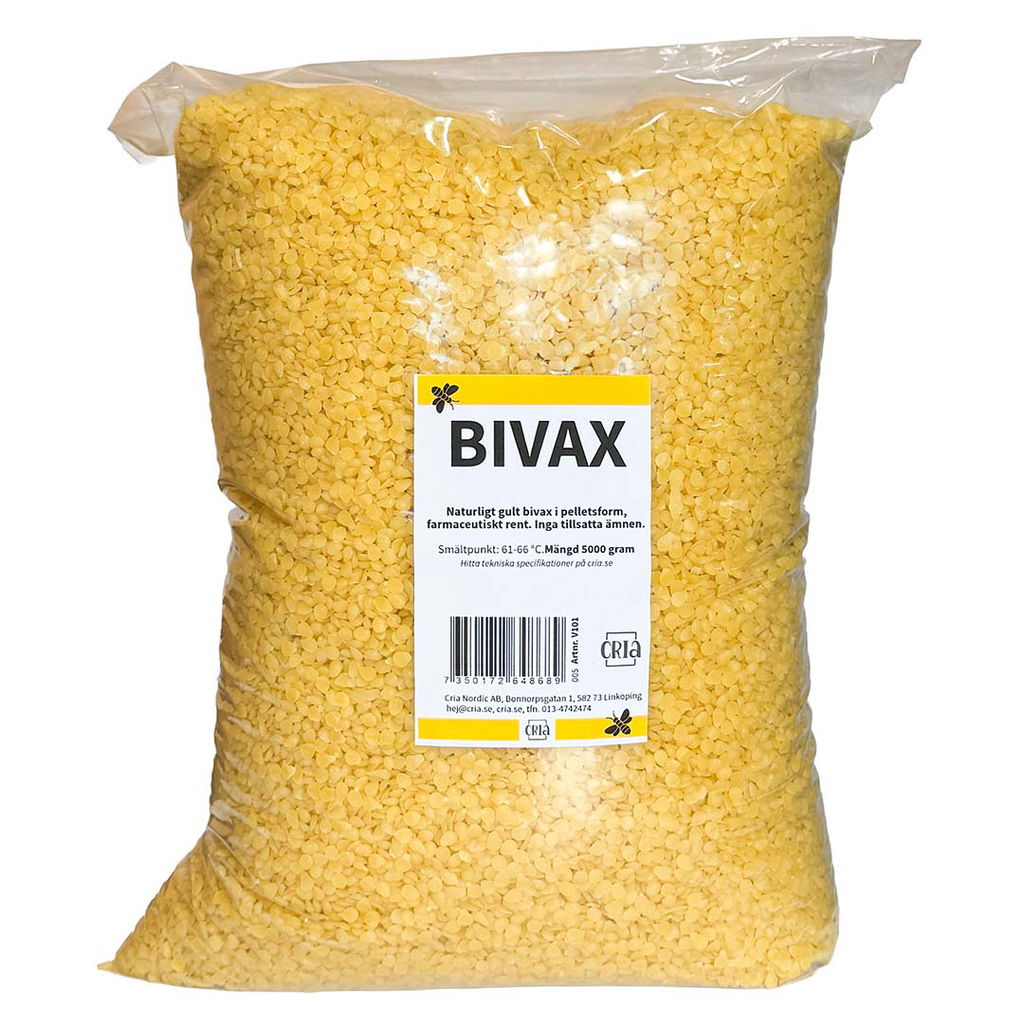 Naturligt gult bivax i pelletsform, farmaceutiskt rent och lätt att arbeta med. Passar för hudvård, ljus, polermedel, bivaxdukar och mer. Mängd 5 kg