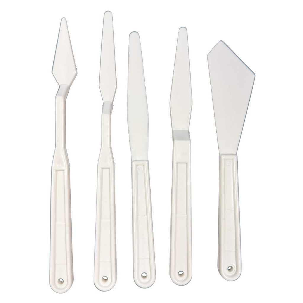 Set med 5 palettknivar i flexibel plast, KreatorStudio. Fem olika former för att blanda, applicera och skapa struktur med akryl och olja.