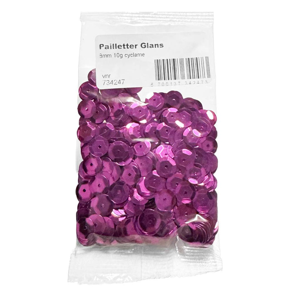 Paljetter i en tydlig cyklamenfärg, en klar rosa-lila ton som sticker ut fint i både små och större pysselprojekt. Storleken är 8 mm, vilket gör dem perfekta när du vill ha en mer framträdande detalj med lite skimmer. Påsen väger 10 g och räcker bra till både textil, kortmakeri och dekorativa inslag.
