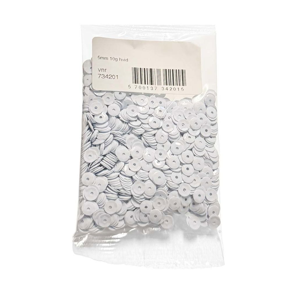 Paljetter i vitt, 5 mm, 10 g. Perfekta för dekoration, pyssel och detaljer i projekt som behöver lite skimmer och färg.
