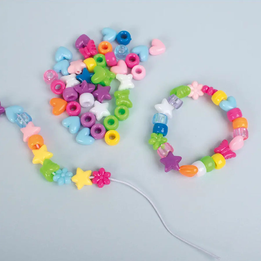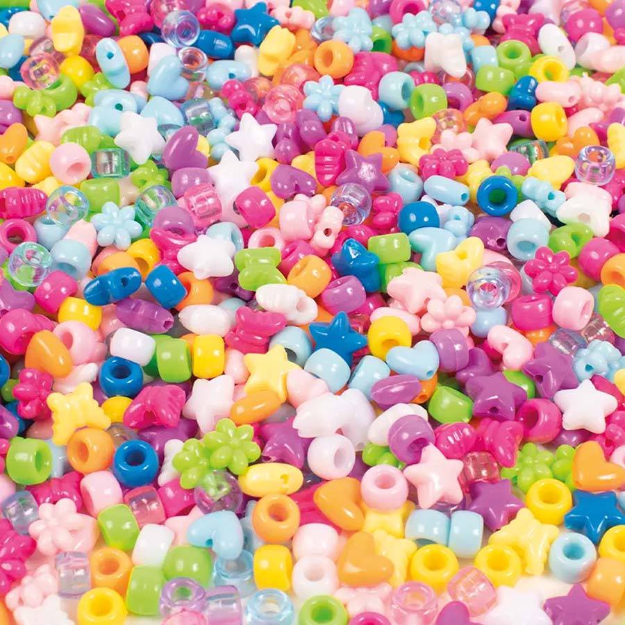 En färgsprakande pärlmix med 200 delar i form av hjärtan, blommor, stjärnor, fjärilar och klassiska pony beads. Alla pärlor har större hål så att snöret som ingår går lätt igenom. Passar för att göra armband, halsband, nyckelringar och små dekorationer.