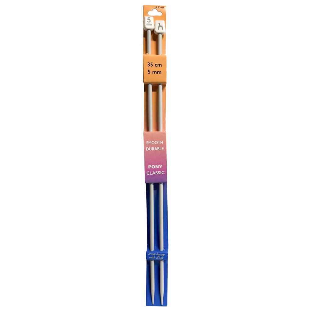 Lätta jumperstickor i aluminium från Pony, 35 cm långa och 5 mm tjocka. Med slät yta som gör att garnet glider lätt och stickningen blir jämn.