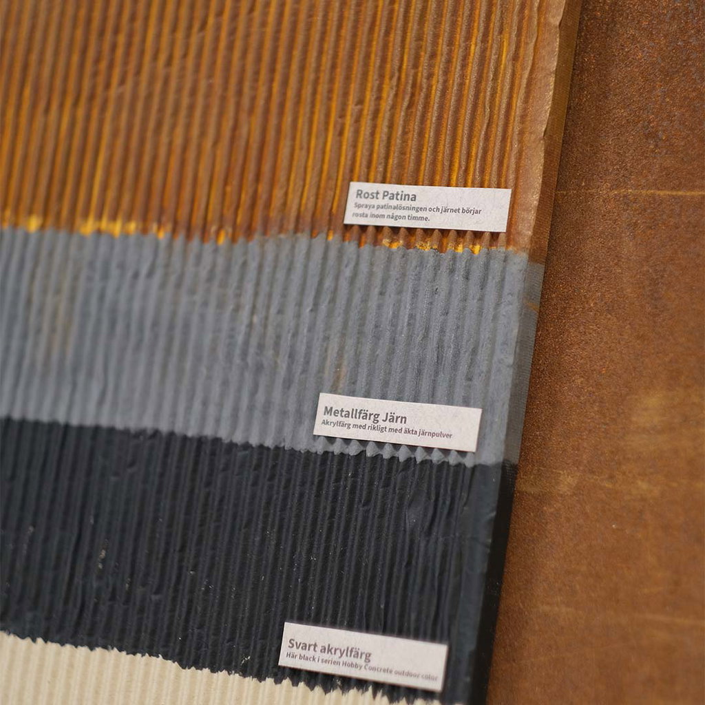 Kittet består av två delar. Metallfärg järn och Rost Patina. Metallfärg järn är en färg som innehåller rikligt med järnpulver och patinavätskan skapar oxideringen.
