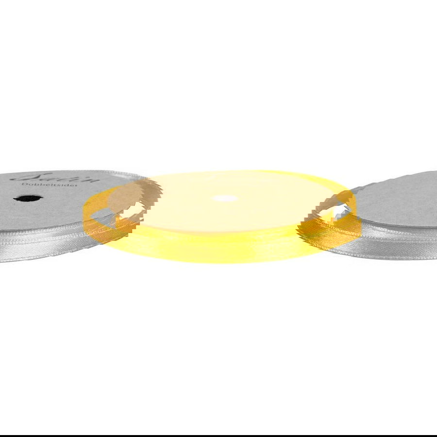 Gult satinband, 6 mm brett och 10 meter långt. Dubbelsidigt för ett snyggt resultat i både rosetter, dekorationer och presentinslagning.