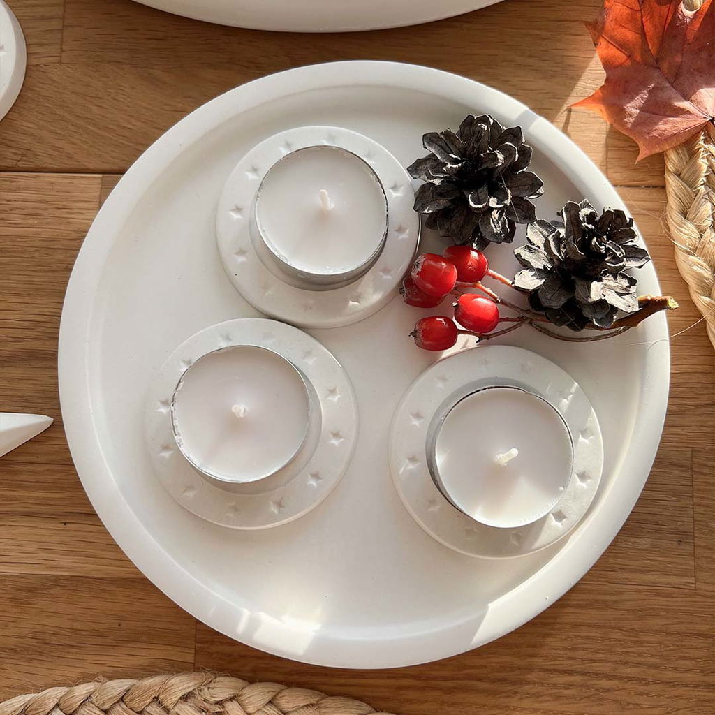 Liten enkel värmeljushållare med motiv av små stjärnor. Vintrig och lättplacerad värmeljushållare som gör sig fin i alla miljöer. Gjut med betong eller gips. Storlek 6,4 cm.