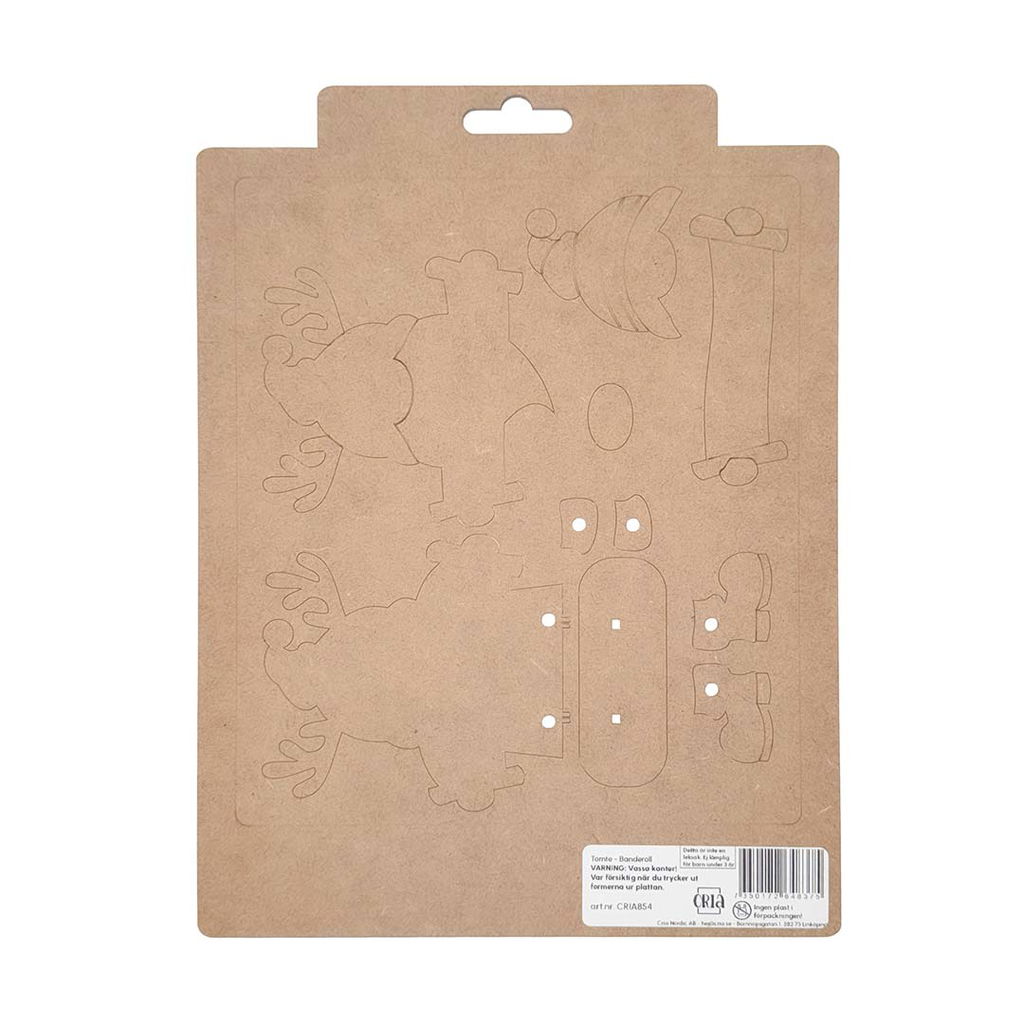 Tomte i trä som håller en banderoll du kan skriva egen text på. Ett kreativt och personligt DIY-kit som passar hela familjen i jul.