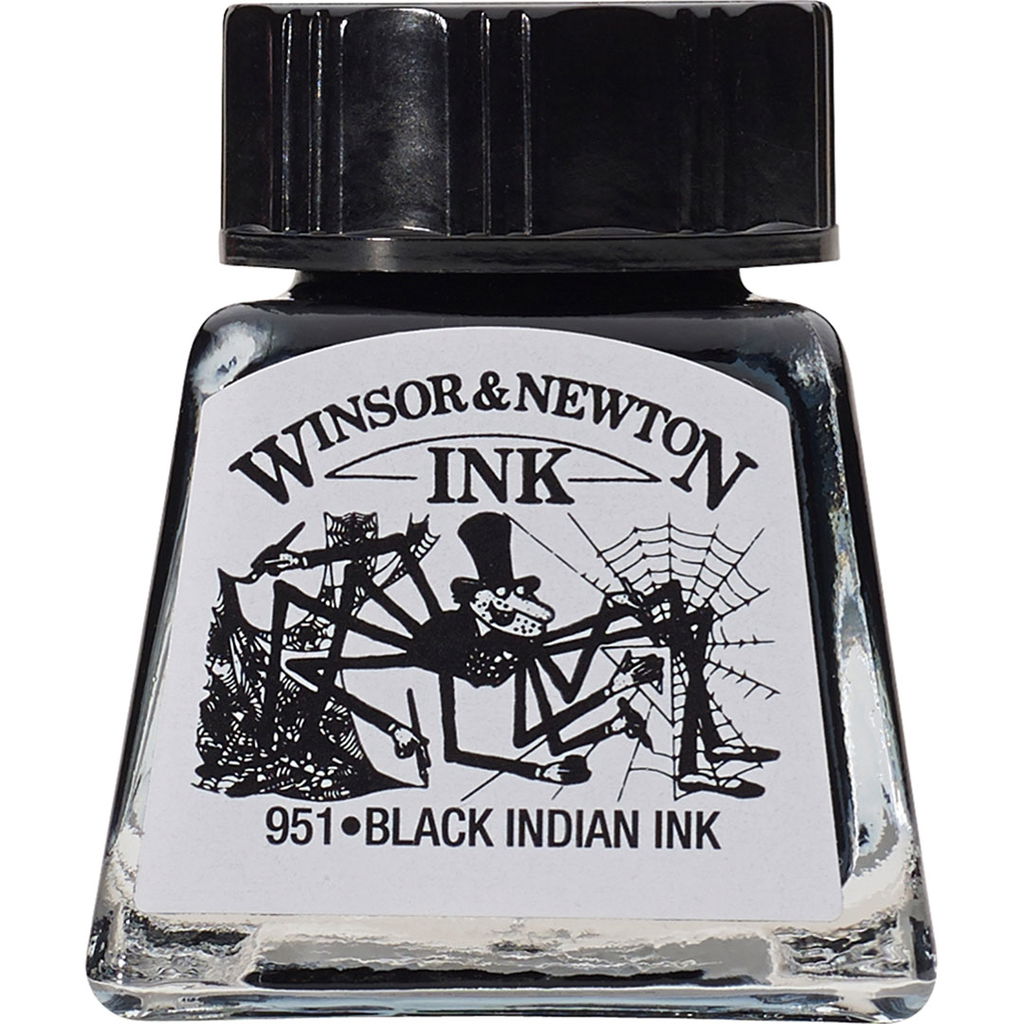 Svart Indian Ink från Winsor & Newton, 14 ml. Pigmentbaserat, snabbtorkande och vattenfast bläck för pensel, doppennor eller airbrush.