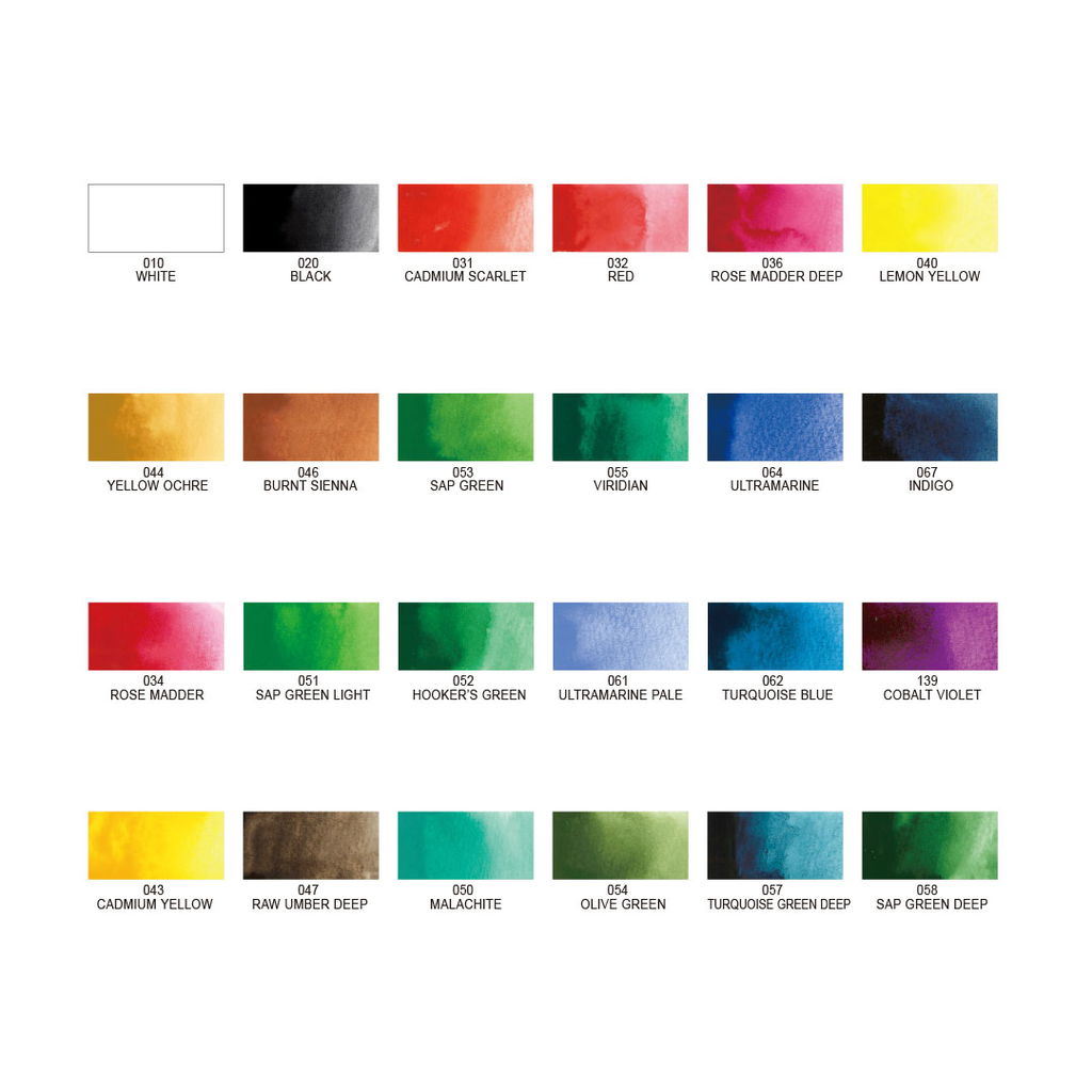 Innehåller följande färger: No.10 White, No.20 Black, No.31 Carmine Scarlet, No.32 Red, No.34 Rose Madder, No.36 Rose Madder Deep, No.139 Cobalt Violet, No.40 Lemon Yellow, No.43 Crimson Yellow, No.44 Yellow Ochre, No.46 Burnt Sienna, No.47 Raw Umber Deep, No.50 Malachite, No.51 Sap Green Light, No.52 Hooker’s Green, No.53 Sap Green, No.54 Olive Green, No.55 Viridian, No.57 Turquoise Green Deep, No.58 Sap Green Deep, No.61 Ultramarine Pale, No.62 Turquoise Blue, No.64 Ultramarine, No.67 Indigo.