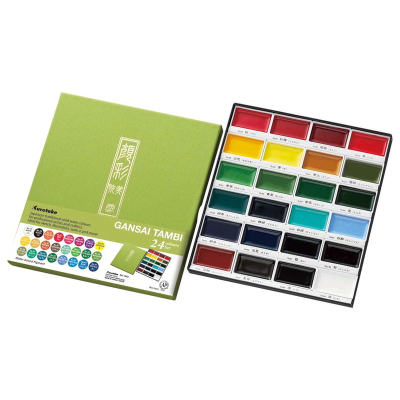 Gansai Tambi är klassiska japanska akvarellfärger, av professionell kvalitet, med rika pigment och en unik känsla som passar både illustration, kalligrafi och traditionell målning. Färgerna är krämiga, halvtransparenta och löses snabbt upp i vatten. De kan användas tunt som akvarell eller mer täckande, likt gouache.